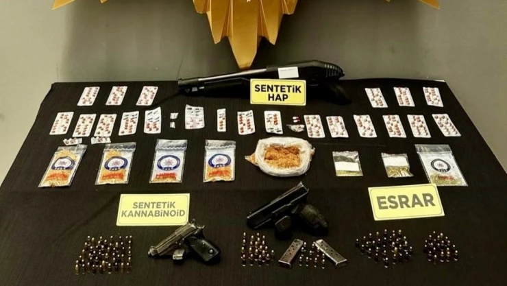 3 aylık fiziki takip sonucunda düzenlenen operasyonda bin 33 adet sentetik ecza, 102,83 gram sentetik kannabinoid maddesi, 17,36 gram esrar maddesi, 9,36 gram metamfetamin maddesi, 2 adet ruhsatsız tabanca, 5 adet şarjör ve 140 adet fişek ve 1 adet pompalı ele geçirilmişti.