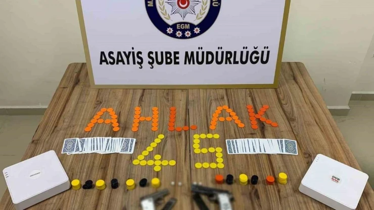 Manisa İl Emniyet Müdürlüğü Asayiş Şube Müdürlüğü Ahlak Büro Amirliği görevlilerince Şehzadeler ilçesinde bir ikamette kumar oynandığı bilgisi alınması üzerine saat 04.00 sıralarında yapılan baskında, 387 adet pul, 208 adet iskambil kağıdı, 11 adet okey taşı, 4 adet zar, 2 adet kamera kayıt cihazı, 2 adet ruhsatsız tabanca, 15 adet fişek ele geçirildi.