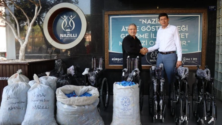 Nazilli esnaflarından Recep Bayraktar ve ailesi topladıkları 60 bin mavi kapağı Nazilli Belediyesi’ne teslim ederek karşılığında 5 adet tekerlekli sandalye aldı. Ailesi özellikle kızı Hande Bayraktar’ın gösterdiği gayretle 2 yıllık süreçte topladıkları kapakları Belediye Başkanı Kürşat Engin Özcan’a teslim ederek tekerlekli sandalyeleri ihtiyaç sahiplerine götürmek üzere teslim aldı.