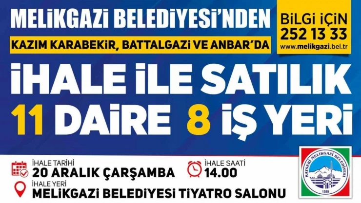 Melikgazi Belediyesi, Kazım Karabekir, Anbar ve Battalgazi Mahallesi’nde mülkiyeti kendisine ait olan 11 adet daire ve 8 adet işyerinin 20 Aralık 2023 Çarşamba günü saat 14.00’te ihale ile satışını gerçekleştirecek.