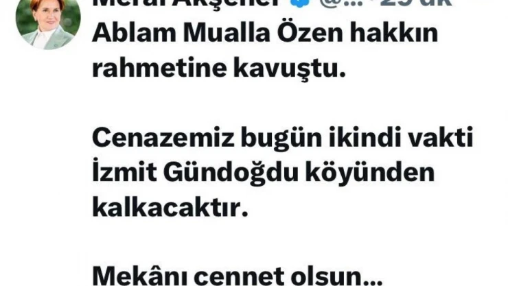 İYİ Parti Genel Başkanı Meral Akşener, ablası Mualla Özen'in hayatını kaybettiğini sosyal medyadan duyurdu. Akşener, ablasının cenazesi için bugün Kocaeli'ye geliyor.