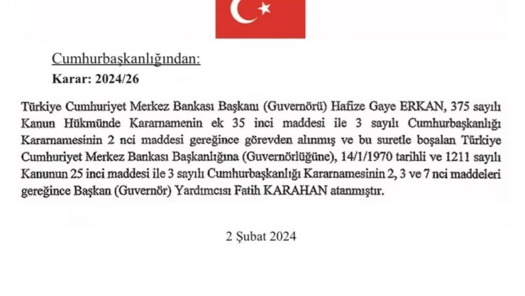Merkez Bankası Başkanı Hafize Gaye Erkan, sosyal medya hesabından paylaşım yaparak görevden affını talep ettiğini açıkladı. Erkan’ın paylaşımının ardından Hazine ve Maliye Bakanı Mehmet Şimşek ise Erkan’ın aldığı kararın şahsi ve kendi takdirinde olduğunu açıkladı. Açıklamaların ardından 3 Şubat 2024 tarihli ve 32449 sayılı Resmi Gazete’de yayımlanan Atama Kararı ile birlikte Hafize Gaye Erkan 375 sayılı Kanun Hükmünde Kararnamenin ek 35’inci maddesi ile 3 sayılı Cumhurbaşkanlığı Kararnamesinin 2’nci maddesi gereğince görevden alındı. Boşalan Merkez Bankası Başkanlığına 14.1.1970 tarihli ve 1211 sayılı Kanunun 25’inci maddesi ile 3 sayılı Cumhurbaşkanlığı Kararnamesinin 2, 3 ve 7’nci maddeleri gereğince Başkan Yardımcısı Fatih Karahan atandı.