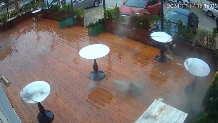 Meteorolojinin uyarı yaptığı Doğu Akdeniz Bölgesi’nde yağışlı hava etkili olurken, Mersin’de de sabah saatlerinde başlayan yağmur akşam saatlerine kadar devam etti. Yağmurla birlikte bölgede yıldırım düşmeleri de yaşandı. Düşen yıldırımlardan biri merkez Yenişehir ilçesinde bulunan 13 katlı bir binaya isabet etti. Yıldırım düşmesi sonucu binadan kopan taş parçaları park halindeki iki araca ve bir kafeye zarar verdi. Korku dolu anların yaşandığı olay kafenin güvenlik kamerasına saniye saniye yansıdı. Görüntülerde yıldırım düşmesi sonucu ortaya çıkan ışık ve sonrasında kafenin önündeki masaların üzerine taşların düştüğü anlar yer aldı.