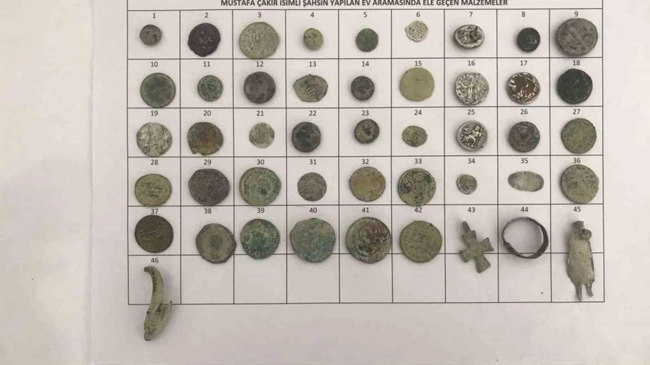 Mersin’in Mut ilçesinde jandarma ekiplerinin yaptığı çalışmada Roma ve Bizans dönemlerine ait sikke, kolye ve yüzükten oluşan 46 parça tarihi eser ele geçirildi.