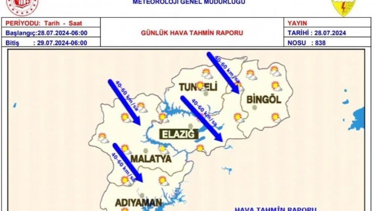 Meteoroloji 13. Bölge Müdürlüğü, Elazığ için kuvvetli rüzgar uyarısı yaptı.