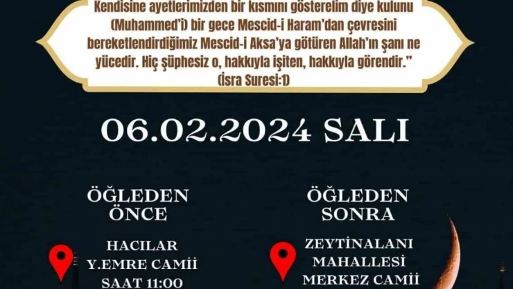 6 Şubat 2024 Salı gününü Çarşambaya bağlayan gece Müslümanlar için kutsal sayılan Miraç Kandili idrak edilecek. Köyceğiz’de Miraç Kandili vesilesiyle başta depremde hayatını kaybeden vatandaşlar ile tüm şehitler için dualarda bulunulacak. 6 Şubat 2024 Salı günü gündüz Beyobası Merkez Camii, Hacılar Yunus Emre Camii ile Zeytinalanı Merkez Camiinde bayanlara yönelik, akşam namazından sonra da Köyceğiz’deki tüm camilerde olduğu gibi Köyceğiz Merkez Hacıbey Camiinde Kandil özel programı gerçekleştirilecek.