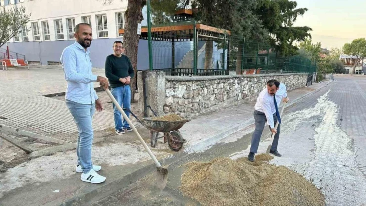 Müdür ve aile birliği başkanı okulları için amelelik yaptı