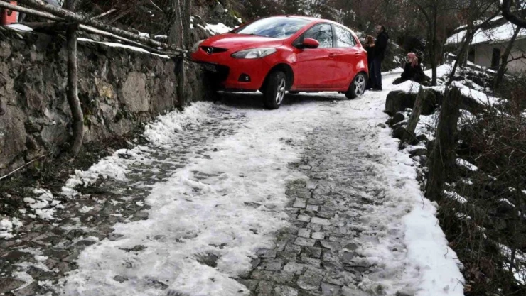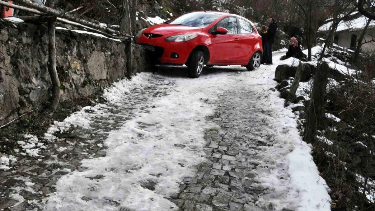 BOLU (İHA) – Tatil için İstanbul’dan Bolu’nun Mudurnu ilçesine gelen 4 kişilik aile ölümden döndü. Buzlu yolda kayan otomobil, duvara çarptıktan sonra uçuruma yuvarlanmaktan son anda kurtuldu.