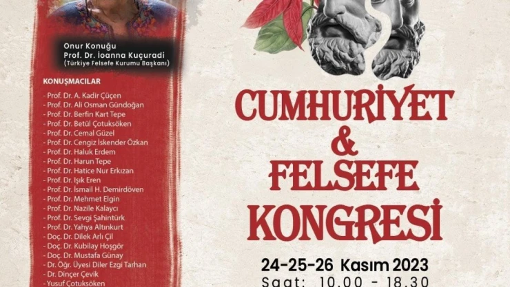 umhuriyetin 100. Yılı ve Dünya Felsefe Günü nedeniyle 24-26 Kasım 2023 tarihlerinde Muğla’da Büyükşehir Belediyesi’nin düzenleyeceği “Cumhuriyet ve Felsefe” konulu kongrede Cumhuriyetten günümüze felsefe alanında önemli çalışmalarda bulunan düşünürler ele alınacak.