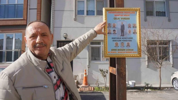 Muhtar adayı, altın yaldızlı çerçeveyle destek istiyor
