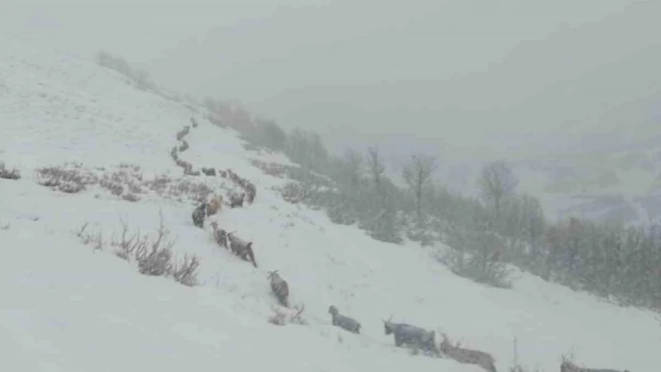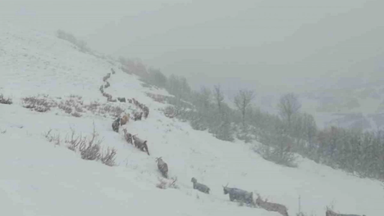 Muş’ta etkili olan kar yağışı nedeniyle 241 köy yolu ulaşıma kapanırken, merada otlatılan keçiler ise kara yakalandı.