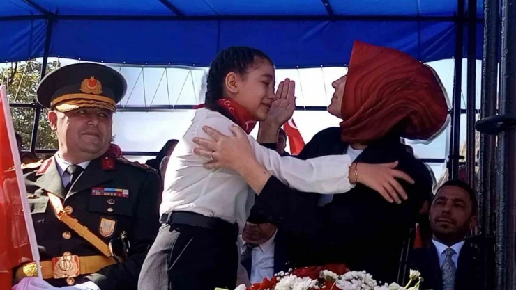 Afyonkarahisar'da Cumhuriyet Bayramı kutlamalarına katılan ve gördüğü manzara karşısında duygu dolu anlar yaşayan 10 yaşındaki kız çocuğunu vali gözyaşlarını silip, sarılarak mutluluğuna ortak oldu.