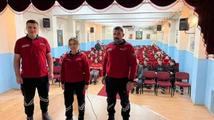 "Hazırsak Güçlüyüz" sloganıyla düzenlenen eğitimde, NAFAD üyeleri öğrencilere afet öncesi, sırası ve sonrasında yapılması gerekenler hakkında bilgiler verdi.