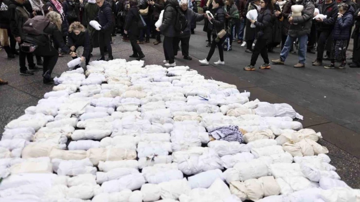İsrail’in havadan, karadan ve denizden abluka alarak Gazze Şeridi’ne gerçekleştirdiği saldırılara dünya kamuoyunun tepkisi sürüyor. ABD’nin New York kentinde yüzlerce kişi, İsrail’in Gazze Şeridi’ne yönelik devam eden ağır bombardımanına tepki göstermek için sokaklara döküldü. Manhattan bölgesindeki Bryant Parkı’nda toplanan göstericiler, ellerinde İsrail’in saldırılarında ölen Gazzeli çocukları temsil eden kefene sarılı maketlerle ünlü Times Meydanı’na doğru yürüdü. Gazze’de derhal ateşkes ilan edilmesi çağrısında bulunan göstericiler, kefene sarılı 500 bebek maketini caddeye bıraktı.