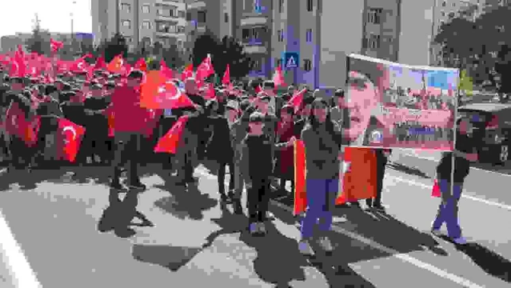 Kayseri’de ilk ve ortaokul öğrencileri, Cumhuriyet’in 100. yılında Türk bayrakları ile yürüyüş düzenlendi.