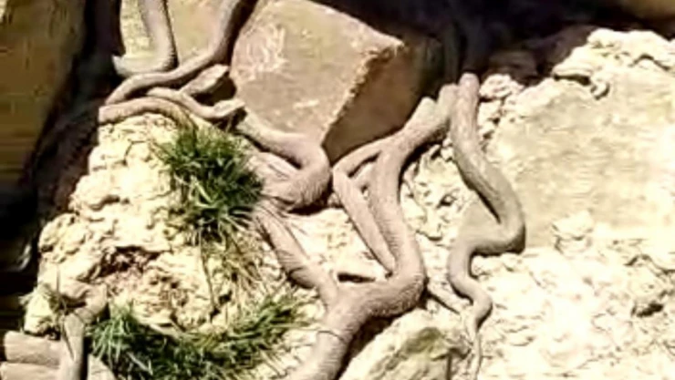 Hakkari'nin Yüksekova ilçesinde ölümcül zehre sahip olan engerek yılanları, sürü halinde güneşlenirken görüntülendi.
