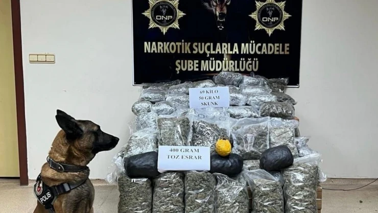 Osmaniye İl Emniyet Müdürlüğü ekipleri, Uyuşturucuyla Mücadele Çalışmaları çerçevesinde E90 otoyolunda seyir halinde olan minibüsü dinlenme tesisinde oluşturulan uygulama noktasında durdurdu. Minibüste hassas burunlu narkotik köpeği ile yapılan aramada gizli bölmelere saklanmış halde 69 Kilo Skunk maddesi ve 400 gram toz esrar ele geçirildi.
