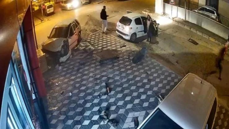 Görüntüde; çarpışmanın etkisiyle savrulan otomobillerden birinin önce çöp konteynerine ardından iş yerinin kapısına zarar verdiği anlar yer aldı. Devriye gezen polis ekiplerinin olay yerine yöneldiğini gören otomobil sürücüsünün kaçtığı ve polislerin peşine koştuğu anlar da güvenlik kamerasına yansıdı. Kaza sonrası diğer otomobil sürücü ve yanında bulunduğu bir yolcunun da birbirlerine sarıldığı görüldü.