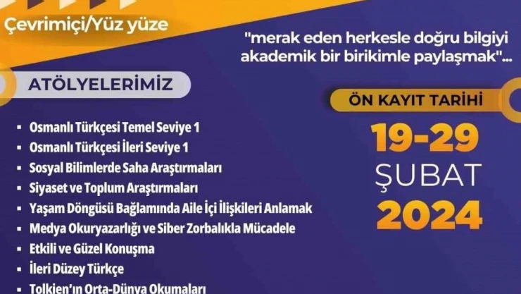 Bu doğrultuda, ilk aşamada açılması planlanan atölyeler şunlardır: “Osmanlı Türkçesi (Temel Seviye), Osmanlı Türkçesi (İleri Seviye), İş İngilizcesi 1, Sanat Eserlerine Felsefe ile Bakmak, Karşılaştırmalı Dünya Mitolojileri 1, Tolkien’ın Orta-Dünya Okumaları, Sosyal Bilimlerde Saha Araştırmaları, Siyaset ve Toplum Araştırmaları, Yaşam Döngüsü Aile İçi İlişkileri Anlamak, Medya Okuryazarlığı ve Siber Zorbalıkla Mücadele, Köktürk Yazı Sistemi ve Köktürkçeye Giriş, Etkili ve Güzel Konuşma, Çocuklar İçin Felsefe Uygulayıcı Eğitimi, İleri Düzey Türkçe.”
