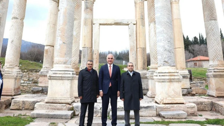 Bakan Ersoy yaptığı konuşmaya şöyle devam etti; “Afrodisias’ta kent parkı ve havuzun yanı sıra en ihtişamlı yapılardan biri olan Tetrapilon’da konservasyon, Tetrastoon’da ise kazı ve restorasyon çalışmalarını başlatıyoruz. Antik dönemde Afrodisias’taki bazilika kentin en büyük kapalı binasıydı. Binanın ön cephesine odaklanan yeni bir proje ile devasa giriş sütunlarını ayağa kaldırma çalışmalarını 2023 yılında tamamlamış ve binanın cephesinde Diokletianus’un ‘tavan fiyat fermanı’nı sergilemiştik. Şimdi ise hazırladığımız yeni projeyle binanın kalan kısmı için kazı yapacak, mozaiklerin konservasyonunu tamamlayacak ve sütunları ayağa kaldırarak yapının ziyaretçiler tarafından algılanmasını kolaylaştıracağız. Yaklaşık 120 yıl önce kazılan ve aradan geçen zamanda tekrar toprak altında kalan gymnasiumu kazarak yapıyı yeniden ortaya çıkaracak ve ziyaretçi güzergahına alternatif oluşturacağız. Proje çerçevesinde hamam odalarını da ziyaretçiye açacağız. Agora’da yapılacak kazı çalışmalarıyla Afrodisias’ta yeni bir yapıyı daha ortaya çıkaracağız. Kentin sur duvarlarını da görünür hale getirmiş olacağız.” şeklinde konuştu.