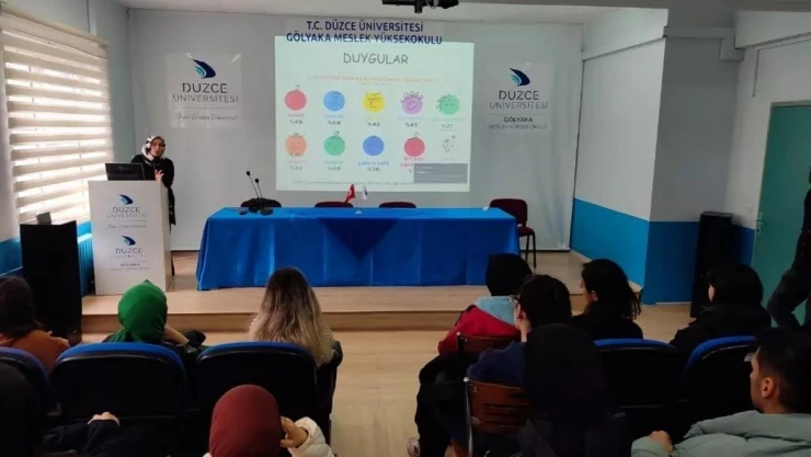 Gölyaka MYO öğrencilerine Kendine İyi Bak semineri verildi. Seminere konuşmacı olarak Düzce Sağlık Müdürlüğü Halk Sağlığı Hizmetleri Başkanlığında görevli Psikolog Zeynep Alçelik Uran katıldı. Uran, 138 öğrencinin katıldığı seminerde bağımlılık, stres ve öfke ile başa çıkma, hayatımızdaki zorluklar ve mücadele durumlarına değindi.