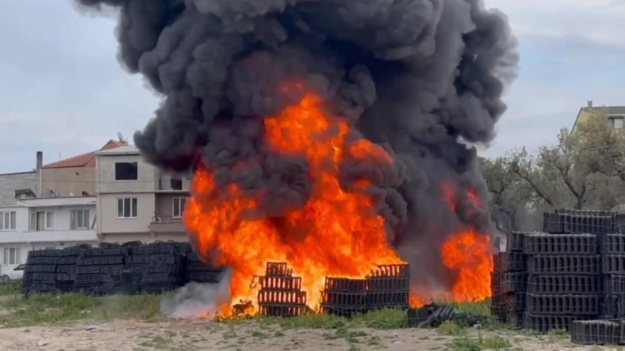 Bursa'nın İznik ilçesinde bir zeytin bahçesinde istif halde bırakılan plastik kasalar alev alev yandı. İlçenin birçok yerinden görülen siyah duman korkuya sebep olurken, yangın itfaiye ekipleri tarafından kısa sürede söndürüldü.