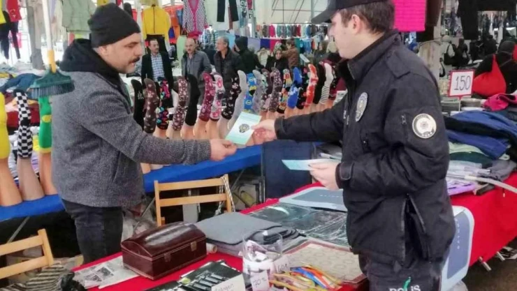 Düzce’de polis ekipleri vatandaşın yanında olmaya devam ediyor. Vatandaşların huzuru ve güvenliği için 24 saat görev yapan polisler çarşı, pazar gezerek aynı zamanda da bilgilendiriyor. Asayiş, Çocuk ve Toplum Destekli Polislik Şube Müdürlükleri tarafından kadınların ve çocukların maruz kaldığı şiddet, taciz gibi kötü eylemleri biraz da olsun engellemek adına kullanıcılara sunulmuş resmi bir uygulama olan Kadın Destek Uygulaması (KADES), dolandırıcılık ve bisiklet hırsızlıkları önleme amacıyla bilgilendirme yapılarak tek tek broşür dağıtımı yapıyor.