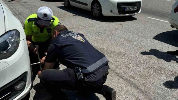 Uygulama esnasında lastiğinin patlak olduğu görülen bir vatandaşın otomobil lastiği ilçe emniyet müdürlüğü ekipleri tarafından değiştirilerek yolculuğuna devam etmesi sağlandı.