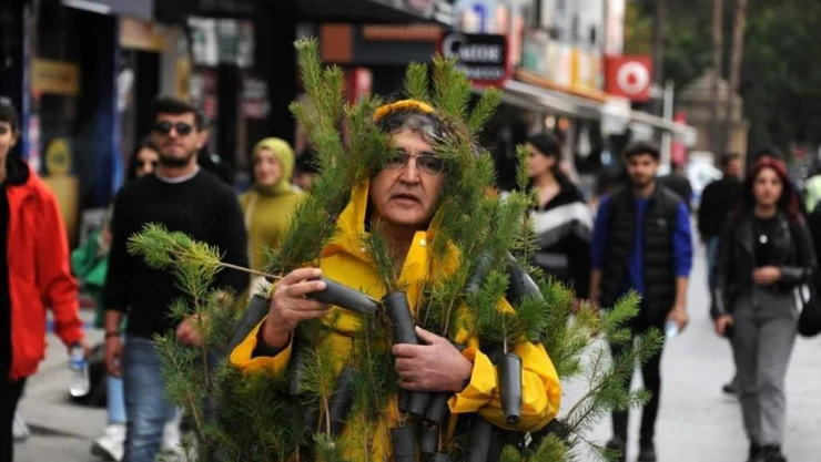 Erzincan'da sarı renkli yağmurluk üzerine vücudunun tamamına çam fidanlarını asıp cadde ve sokakları yürüyen profesörün halini görenler gözlerine inanamadı.
