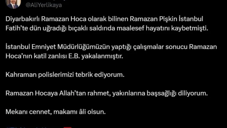 ’Diyarbakırlı Ramazan Hoca’ olarak bilinen Ramazan Pişkin, İstanbul Fatih’te uğradığı bıçaklı saldırıda hayatını kaybetmişti. İçişleri Bakanı Ali Yerlikaya, sosyal medya hesabından yaptığı açıklamada “İstanbul Emniyet Müdürlüğümüzün yaptığı çalışmalar sonucu Ramazan Hoca’nın katil zanlısı E.B. yakalanmıştır. Kahraman polislerimizi tebrik ediyorum. Ramazan Hocaya Allah’tan rahmet, yakınlarına başsağlığı diliyorum” ifadesini kullandı.