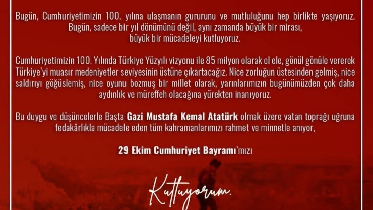 Cumhuriyetimizin 100. Yılında Türkiye Yüzyılı vizyonu ile 85 milyon olarak el ele, gönül gönüle vererek Türkiye’yi muasır medeniyetler seviyesinin üstüne çıkartacağız. Nice zorluğun üstesinden gelmiş, nice saldırıyı göğüslemiş, nice oyunu bozmuş bir millet olarak, yarınlarımızın bugünümüzden çok daha aydınlık ve müreffeh olacağına yürekten inanıyoruz. Bu duygu ve düşüncelerle Başta Gazi Mustafa Kemal Atatürk olmak üzere vatan toprağı uğruna fedakârlıkla mücadele eden tüm kahramanlarımızı rahmet ve minnetle anıyor, 29 Ekim Cumhuriyet Bayramı’mızı kutluyorum.” ifadelerine yer verdi.