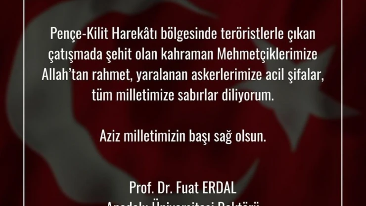 Anadolu Üniversitesi Rektörü Pençe-Kilit Harektı bölgesinde şehit olan askerler için taziye mesajı yayımladı.
