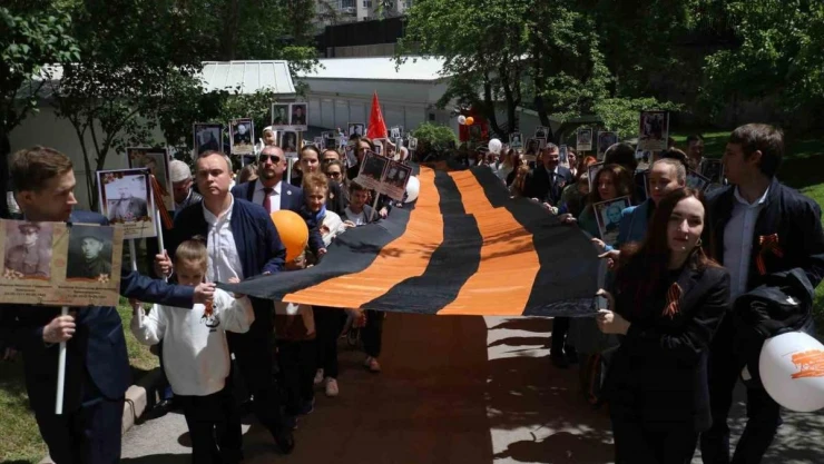 Rusya’nın Ankara Büyükelçiliği’nde 9 Mayıs Zafer Günü kutlamaları çerçevesinde düzenlenen ’Ölümsüz Alay’ yürüyüşünde 2. Dünya Savaşı’nda yer alan aile büyüklerinin fotoğraflarının bulunduğu dövizler taşındı ve marşlar söylendi.