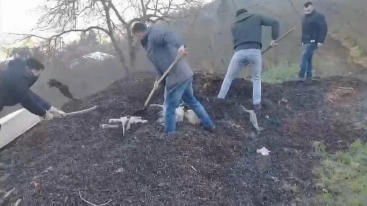 Bir diğer operasyon ise Cumayeri Üvezbeli köyünde yapıldı. İl Jandarma Komutanlığı KOM ve İstihbarat Şube Müdürlüklerinin istihbari çalışmaları neticesinde M.E. isimli şüphelinin evinde sahte alkol imal edip, sattığı tespit edildi. Dün saat 12.00 sıralarında ikamette yapılan aramada ise şüphelinin alkol bidonlarını sakladığı yer hayrete düşürdü. Ekipler tarafından yapılan incelemede, etil alkol bidonlarının ve bazı dolu içkilerin gübre içine saklandığı belirlendi. Gübreyi kürekle kazıyan ekipler şişe ve bidonları çıkardı. Evin odunluğun da boş içki şişeleri bulundu.