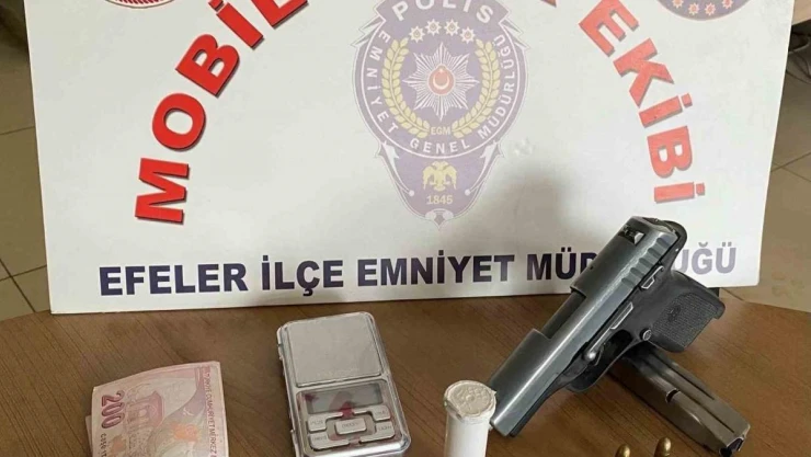 Aydın İl Emniyet Müdürlüğü Devriye Ekipler Amirliği’ne bağlı Mobil Park Ekibi, vatandaşın huzuru için çalışmalarına aralıksız devam ediyor. Edinilen bilgiye göre ekipler, devriye esnasında Osman Yozgatlı Mahallesi Hakkı Bey Caddesi üzerinde bir ticari taksiyi durdurdu. Taksi içerisinde yolcu konumunda bulunan şahıs, kimlik kontrolü esnasında ekiplere farklı bir kimlik gösterdi. Gösterilen kimliğin farklı bir kişiye ait olduğunu fark eden ekipler, yaptıkları araştırma sonucunda şüphelinin T.Y. isimli şahıs olduğunu tespit etti. Yapılan kontrollerde ise şüphelinin üzerinde 1 adet tabanca, 2 adet fişek, 5 gram metamfetamin maddesi, 1 adet hassas terazi ele geçirildi.