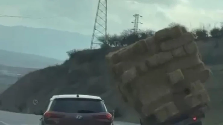 Balıkesir’in Gönen ilçesi seyir halinde olan saman balyası yüklü kamyon devrildi. O anlar cep telefonuyla görüntülendi.