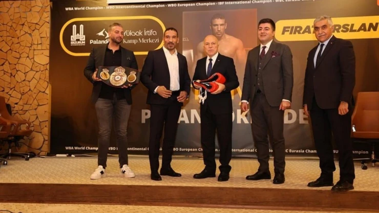 Fırat Arslan, konuşmalardan sonra altın kemeriyle poz verdi ve Büyükşehir Belediye Başkanı Mehmet Sekmen’e imzalı boks eldiveni hediye etti.