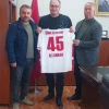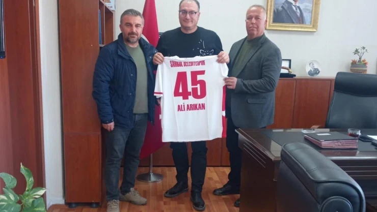 Sarıgöl Belediyespor Kulüp Başkanı Mehmet Akkoyun ve Teknik Direktör Ercan Akdeniz, Sarıgöl Kaymakamı Ali Arıkan’ı makamında ziyaret ederken Sarıgöl Belediyespor’un kırmızı -beyaz renkli üzerinde Ali Arıkan yazan 45 numaralı hatıra formasını hediye etti.