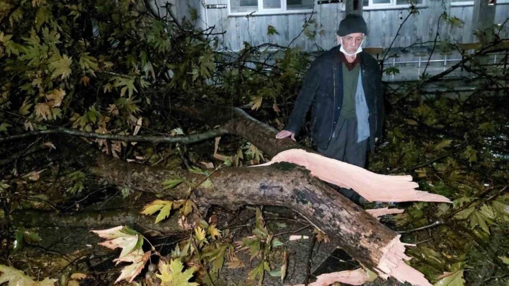 Samsun'da şiddetli rüzgarda cami avlusundaki çınar ağacı gövdesinden kırıldı. Olayın namaz saatinde yaşanmaması faciayı önledi.