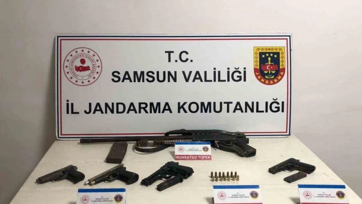 Edinilen bilgiye göre, Samsun’un Vezirköprü ilçesinde O.T. isimli şahsın evinde ruhsatsız silah bulundurduğu bilgisini alan jandarma ekipleri yaptıkları aramada 1 adet ruhsatsız 9 mm. tabanca, 7 adet 9 mm. tabanca fişeği, 3 adet ruhsatsız kurusıkı tabanca, 7 adet kurusıkı tabanca fişeği ve 1 adet ruhsat süresi geçmiş av tüfeği ele geçirdi.