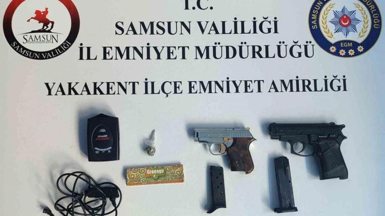 Samsun İl Emniyet Müdürlüğü ve İlçe Emniyet Müdürlüğü ekipleri tarafından huzur ve güven ortamının devamını sağlamak, suç ve suçlularla mücadele, aranan şahıs ve araçların yakalanması, suç işleme amacındaki şahısların caydırılması amacıyla çalışmalar devam ediyor. Çalışmalar çerçevesinde Yakakent İlçe Emniyet Amirliği görevlileri, gerçekleştirdikleri huzur ve güven uygulamasında 1 adet radar tespit cihazı, 2 adet kurusıkı tabanca, 0.4 gram esrar ve kullanım aparatı ele geçirdi. Konuyla ilgili 5 şahsa adli işlem yapılarak, toplamda 12 bin 977 TL trafik cezası uygulandı.