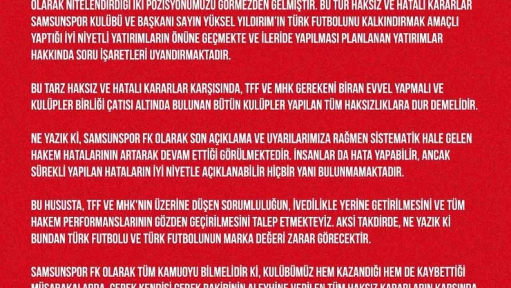 Adana Demirspor müsabakasında utanç dolu anlar yaşandığı ve hakem kararlarının maça damga vurduğunu belirten kırmızı-beyazlılar, "Cevaplandırılması gereken, bunlar daha ne kadar ve nereye kadar bu şekilde devam edecektir? Tüm futbolseverler bu hatalardan dolayı futboldan soğur hale gelmiştir. Müsabaka hakemi ve VAR hakemleri tüm spor kamuoyunun ve TV yorumcularının net penaltı olarak nitelendirdiği iki pozisyonumuzu görmezden gelmiştir. Bu tür haksız ve hatalı kararlar Samsunspor Kulübü ve Başkanı Yüksel Yıldırım’ın Türk futbolunu kalkındırmak amaçlı yaptığı iyi niyetli yatırımların önüne geçmekte ve ileride yapılması planlanan yatırımlar hakkında soru işaretleri uyandırmaktadır. Bu tarz haksız ve hatalı kararlar karşısında, TFF ve MHK gerekeni biran evvel yapmalı ve Kulüpler Birliği çatısı altında bulunan bütün kulüpler yapılan tüm haksızlıklara dur demelidir. Ne yazık ki, Samsunspor FK olarak son açıklama ve uyarılarımıza rağmen sistematik hale gelen hakem hatalarının artarak devam ettiği görülmektedir. İnsanlar da hata yapabilir, ancak sürekli yapılan hataların iyi niyetle açıklanabilir hiçbir yanı bulunmamaktadır. Bu hususta, TFF ve MHK’nın üzerine düşen sorumluluğun, ivedilikle yerine getirilmesini ve tüm hakem performanslarının gözden geçirilmesini talep etmekteyiz. Aksi takdirde, ne yazık ki bundan Türk futbolu ve Türk futbolunun marka değeri zarar görecektir. Samsunspor FK olarak tüm kamuoyu bilmelidir ki, Kulübümüz hem kazandığı hem de kaybettiği müsabakalarda, gerek kendisi gerek rakibinin aleyhine verilen tüm haksız kararların karşısında olmaya, ta ki bu yanlışlar durdurulana kadar devam edecektir. Son olarak, her zaman dediğimiz gibi; Samsunspor FK olarak temiz ve adil futbolun yanında ve onu kirleten kişi ve yapıların her zaman karşısında olacağız. Kamuoyunun dikkatine sunarız" ifadelerini kullandı.