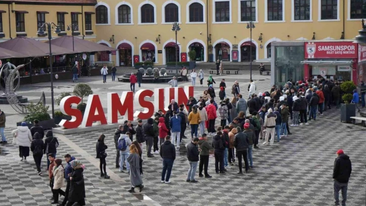 Samsunspor ile Galatasaray Süper Lig’de 12 yıl sonra Samsun’da karşı karşıya gelecek. Samsunsporlu taraftarlar, bugün saat 11.00’de satışa çıkarılan biletlerden alabilmek için sabahın ilk saatlerinden itibaren bilet satış noktalarında uzun kuyruklar oluşturdu. Sıranın kendilerine gelmesini bekleyen taraftarlar, gişeye ulaştıklarında ise şoke oldu. İnternet üzerinden alınan biletler nedeniyle doğu ve batı tribünlerinin biletleri dakikalar içerisinde tükenirken, taraftarlar kale arkalarında kalan biletleri alabilmek için birbirleriyle yarıştı. Çok kısa sürede satışa çıkartılan 30 bin 548 adet biletten 23 bin 500 adeti satılırken, taraftarlar kale arkalarında kalan 7 bin adet bileti almak için uzun sürede kuyrukta beklediler.