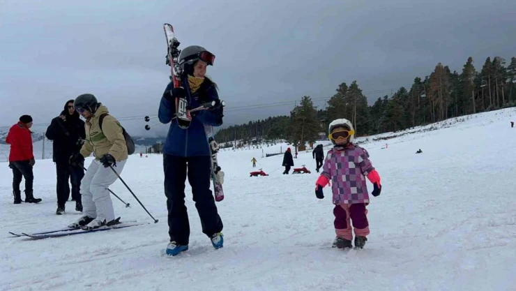 Sezonun başladığı merkeze gelen turistler kayak ve snowboard yaptı, çocuklar kızak kaydı.