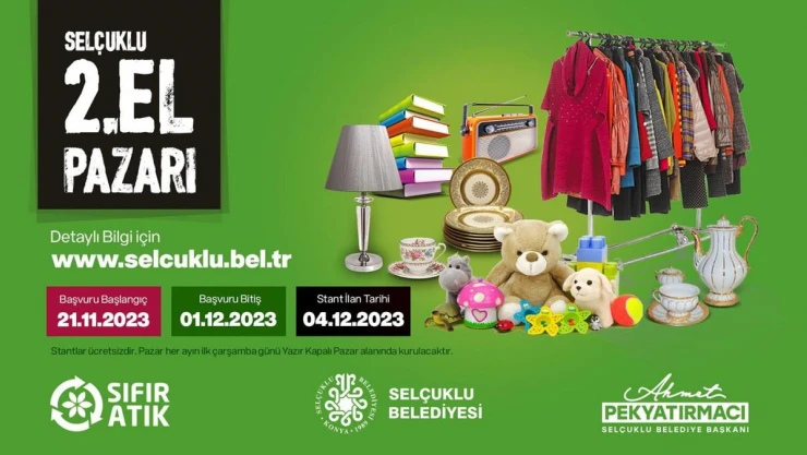 Selçuklu Belediyesinin sıfır atıkla ilgili örnek çalışmalarından bir tanesi olan Selçuklu 2. El Pazarı’nda fincan takımlarından, tabaklara, giysilerden çantalara, eski kitaplardan, oyuncaklara, küçük elektronik eşyalardan radyolara kadar birçok ürün uygun fiyatlara bulunabilecek. İlki 6 Aralık tarihinde açılacak Selçuklu 2. El Pazarı, her ayın ilk çarşambası Yazır Kapalı Pazar Alanı’nda süreklilik kazanacak. Ücretsiz stant açmak isteyen vatandaşlar Selçuklu Belediyesi hizmet masalarına şahsen başvuru yapabilecek.