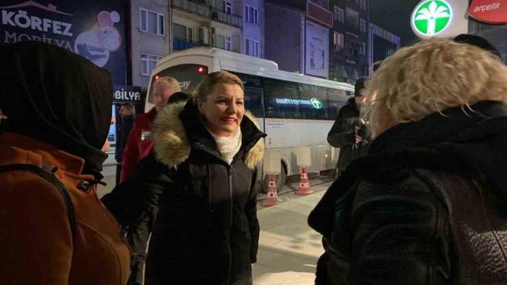 İzmit Belediye Başkanı Fatma Kaplan Hürriyet ve ekibi, işe gitmek için servis bekleyen işçilere poğaça ve meyve suyu ikram etti.