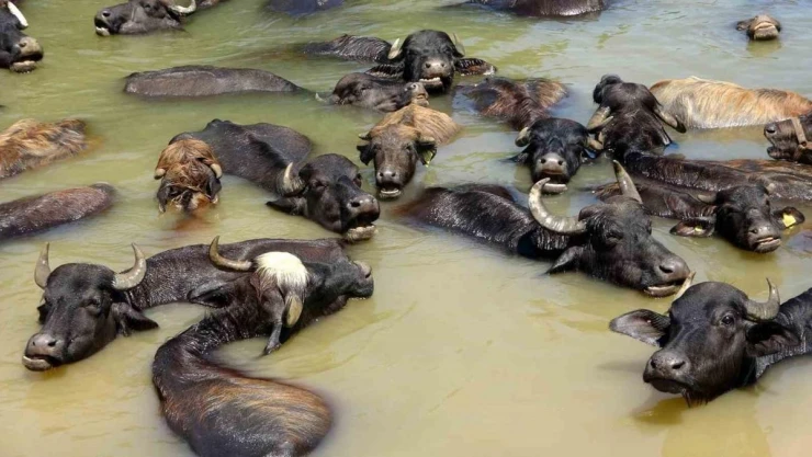 Sıcaktan bunalan mandalar nehirde serinliyor