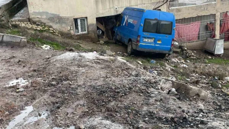 Siirt’te sürücüsünün kontrolünden çıkan kargo aracı zemin kattaki bir evin balkonuna daldı.