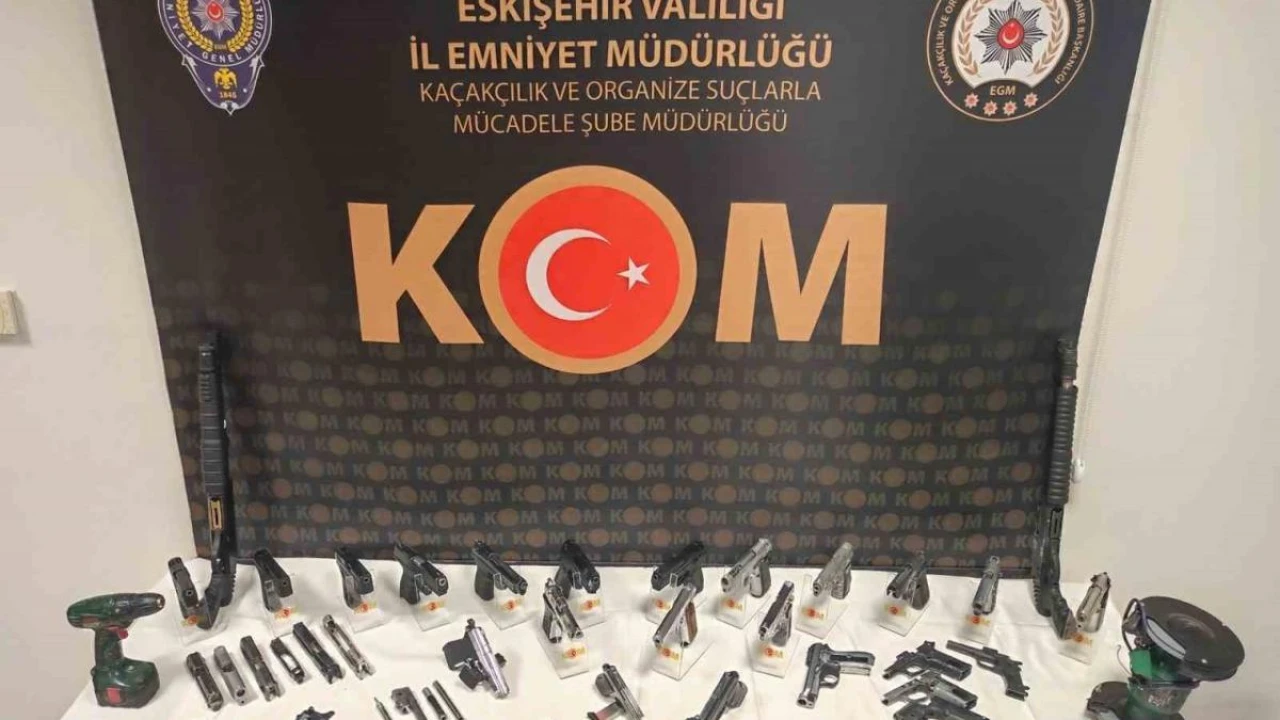 Edinilen bilgilere göre, Eskişehir Cumhuriyet Başsavcılığı’nın koordinesinde, İl Emniyet Müdürlüğü’ne bağlı Kaçakçılık ve Organize Suçlarla Mücadele Şube Müdürlüğü (KOM) ekiplerince, ‘Silah Ticareti’ne yönelik çalışmalar yürütüldü. Yapılan çalışma sonucunda 2 şüpheli yakalanırken, şüphelilerden birinin evini silah atölyesine dönüştürdüğü tespit edildi. Operasyon çerçevesinde şahsın evinde yapılan aramada; 26 ruhsatsız tabanca,2 pompalı tüfek, 134 değişik çap ve markalarda fişek, 6 dolu kartuş, 46 şarjör, 24 silah sürgüsü, 15 silah gövdesi, 10 tabanca namlusu, 7 icra yayı, 8 matkap ucu, 1 pafta takımı, 1 taşlama motoru, 1 şarjlı matkap, 2 hassas terazi ve 10 gram metamfetamin uyuşturucu madde ele geçirildi.