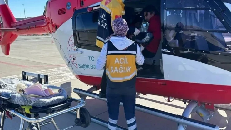 Emine bebek, ileri tetkik ve tedavi için, tahsis edilen Sağlık Bakanlığı ambulans helikopteriyle Elazığ Fethi Sekin Şehir Hastanesine nakledildi.